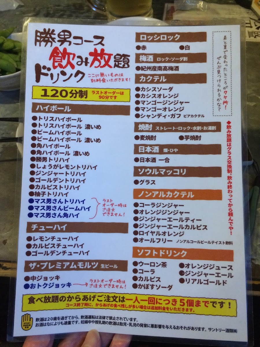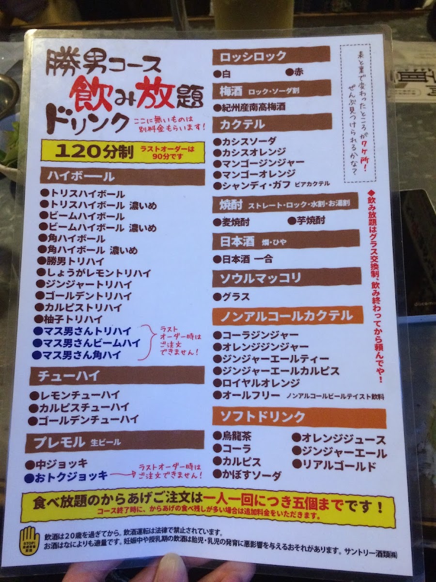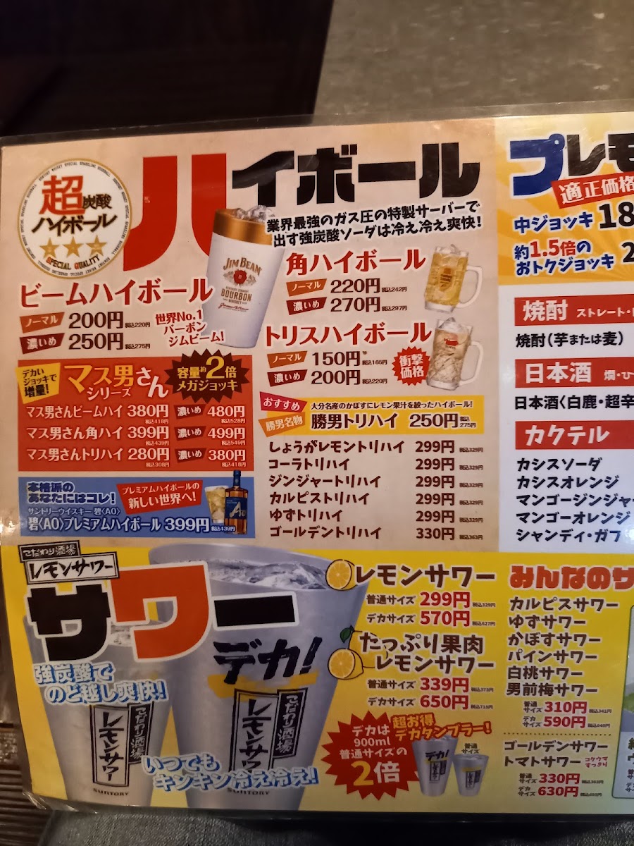 ビール サントリー ザ・プレミアムモルツ 中 ◆ハイボール ビームハイボールビーム/ハイボール 濃いめ/トリスハイボール/トリスハイボール 濃いめ/「名物」勝男トリハイ/しょうがレモントリハイ/コーラトリハイ/ジンジャートリハイ/カルピストリハイ/ゆずトリハイ/ゴールデントリハイ ◆サワー レモンサワー/カルピスサワー/ゆずサワー/かぼすサワー/パインサワー/白桃サワー/男前梅サワー/ゴールデンサワー/トマトサワー/杏仁レモンサワー ◆お茶割り 緑茶ハイ/ウーロンハイ/ジャスミンハイ ◆焼酎 芋/麦 ◆カクテル カシスソーダ/マンゴージンジャー/シャンディ・ガフ ◆梅酒 紀州産 南高梅酒 ◆勝男のタコハイ ナチュラルタコハイ ◆ノンアルコール オールフリー ◆ソフトドリンク ウーロン茶/緑茶/ジャスミン茶/コーラ/ジンジャーエール/かぼすソーダ/カルピス/リアルゴールド