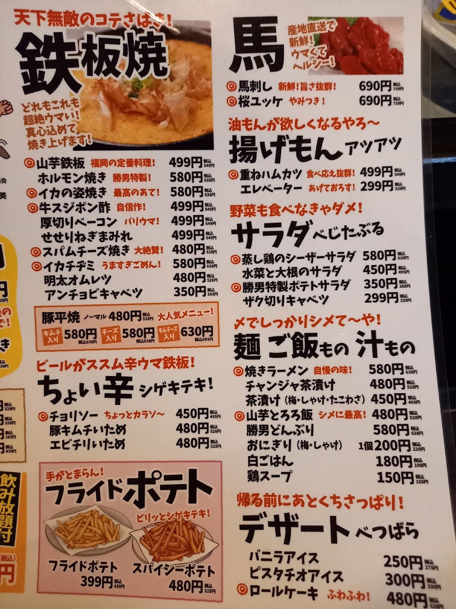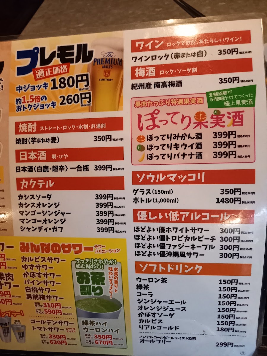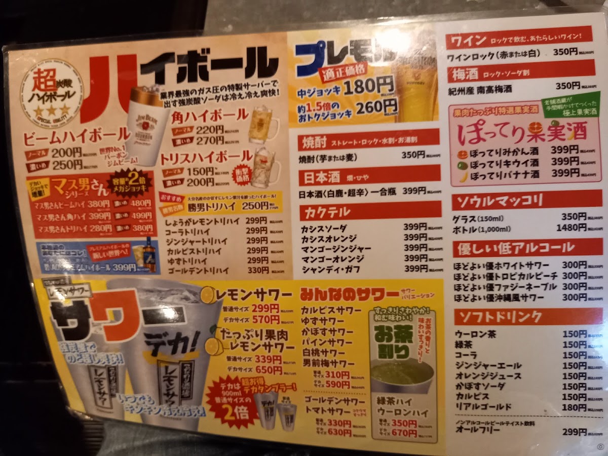 ビール サントリー ザ・プレミアムモルツ 中 ◆ハイボール ビームハイボールビーム/ハイボール 濃いめ/トリスハイボール/トリスハイボール 濃いめ/「名物」勝男トリハイ/しょうがレモントリハイ/コーラトリハイ/ジンジャートリハイ/カルピストリハイ/ゆずトリハイ/ゴールデントリハイ ◆サワー レモンサワー/カルピスサワー/ゆずサワー/かぼすサワー/パインサワー/白桃サワー/男前梅サワー/ゴールデンサワー/トマトサワー/杏仁レモンサワー ◆お茶割り 緑茶ハイ/ウーロンハイ/ジャスミンハイ ◆焼酎 芋/麦 ◆カクテル カシスソーダ/マンゴージンジャー/シャンディ・ガフ ◆梅酒 紀州産 南高梅酒 ◆勝男のタコハイ ナチュラルタコハイ ◆ノンアルコール オールフリー ◆ソフトドリンク ウーロン茶/緑茶/ジャスミン茶/コーラ/ジンジャーエール/かぼすソーダ/カルピス/リアルゴールド