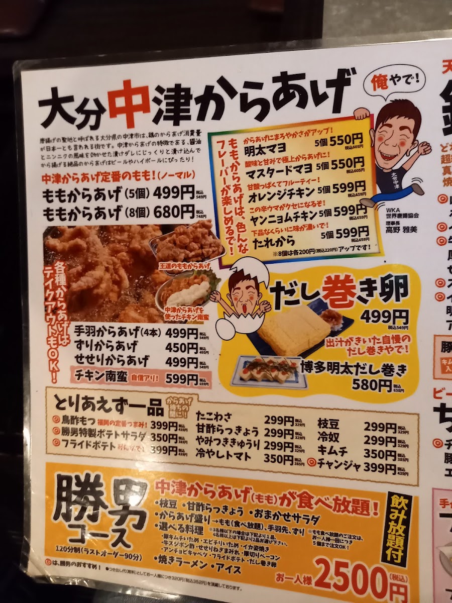 From a reviewer’s perspective, the menu at Oita-Karaage Katsuo offers a concise yet satisfying conclusion to the restaurant’s identity as a lively spot for group dining and casual celebrations. The highlight is clearly the 飲み放題コース: ~勝男のおすすめ宴会コース~, designed with social gatherings in mind. The standout option within this lineup is the 【120分飲放題付】ももからあげ食べ放題!『勝男コース』全8品/2,800円, a well-balanced course that combines value and indulgence. For 2,800円, diners enjoy a 120-minute all-you-can-drink plan alongside a thoughtfully arranged 8-dish course, making it ideal for banquets, drinking parties, or relaxed evenings with friends. At the heart of the course is the restaurant’s signature fried chicken, starting with ももからあげ 5個, which showcases the juicy, flavorful style that Oita karaage is known for. Overall, the menu may not be extensive, but it is clearly focused and purpose-driven, emphasizing generosity, affordability, and the comforting appeal of classic karaage paired with drinks. As a conclusion to the dining experience, Katsuo’s menu leaves the impression of a restaurant that knows its strengths and delivers them confidently, especially for those looking to enjoy good food, good drinks, and a convivial atmosphere in the heart of Osaka.